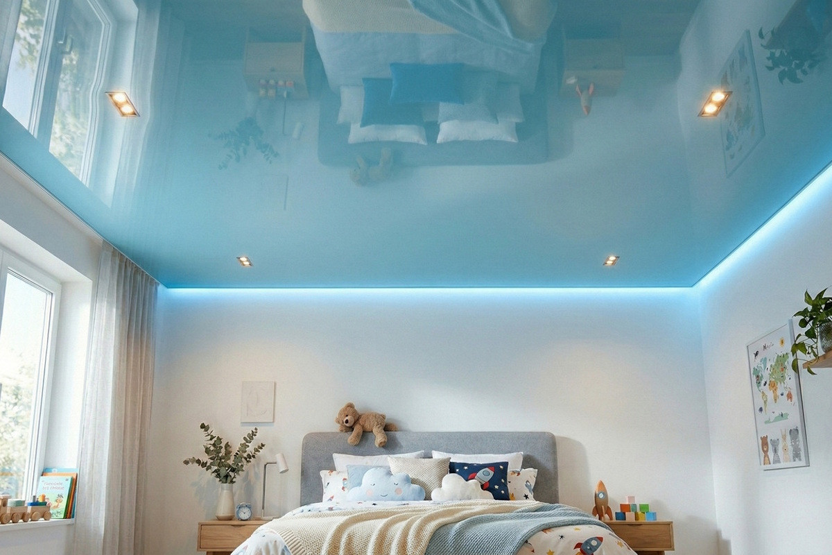 Глянцевые натяжные потолки – самый простой способ визуально расширить пространство, сделать его объемнее. Поливинилхлоридная пленка в разных цветах с лаковым блеском отлично отражает предметы, зрительно добавляя к высоте потолка несколько метров.