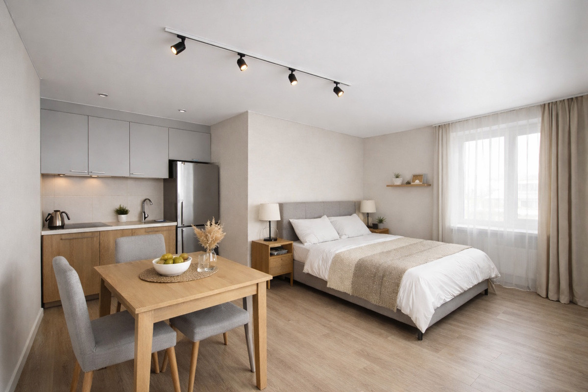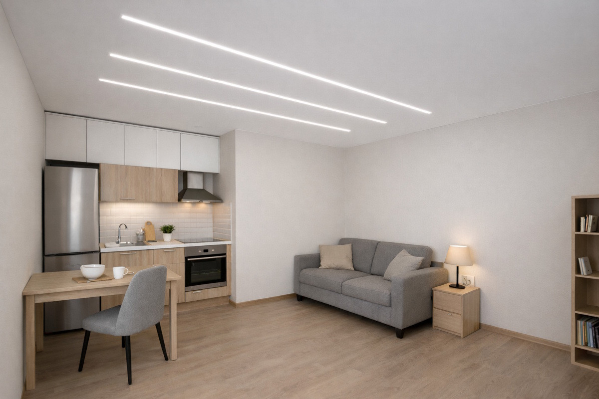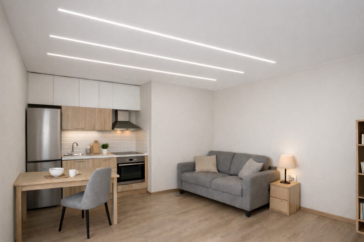 Натяжные потолки в квартиру-студию – отличное решение, чтобы быстро завершить ремонт в новостройке или обновить готовый ремонт.