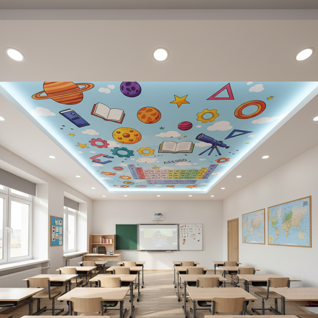 На стадии осмотра помещения наш технолог ответит на вопрос, можно ли устанавливать натяжные потолки в школе. Предоставит все документы и сертификаты соответствия на полотна. Подскажет, какое освещение лучше использовать.