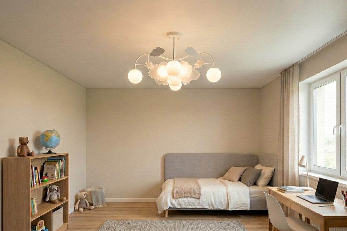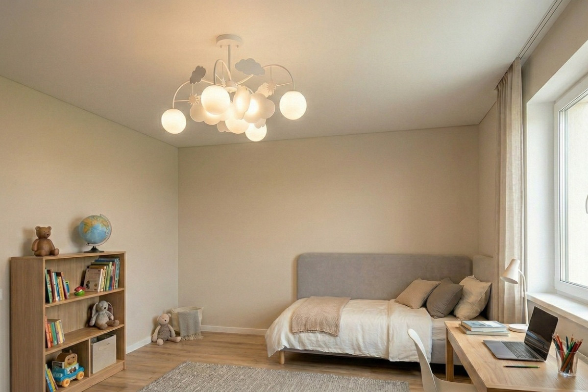 Это один из основных пунктов, на который мы советуем обратить внимание. Не важно, какого цвета вы установите потолок, но грамотно разведенный свет позволит зонировать комнату, добавит ей объема и, конечно, сделает пребывание ребенка максимально комфортным.